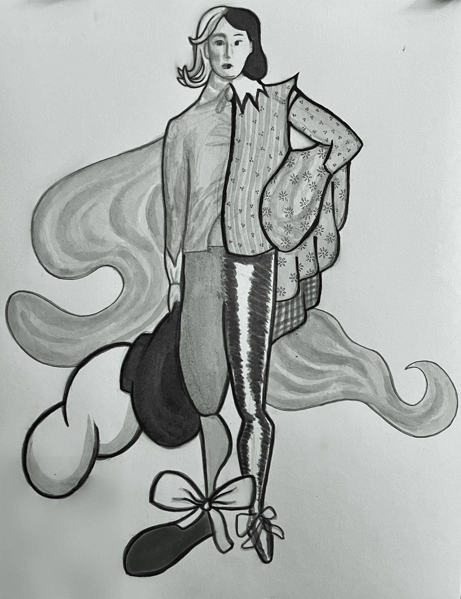 standing figure drawn using 4 different art styles: art nouveau, Japanese woodblock, cartoon, and German expressionism